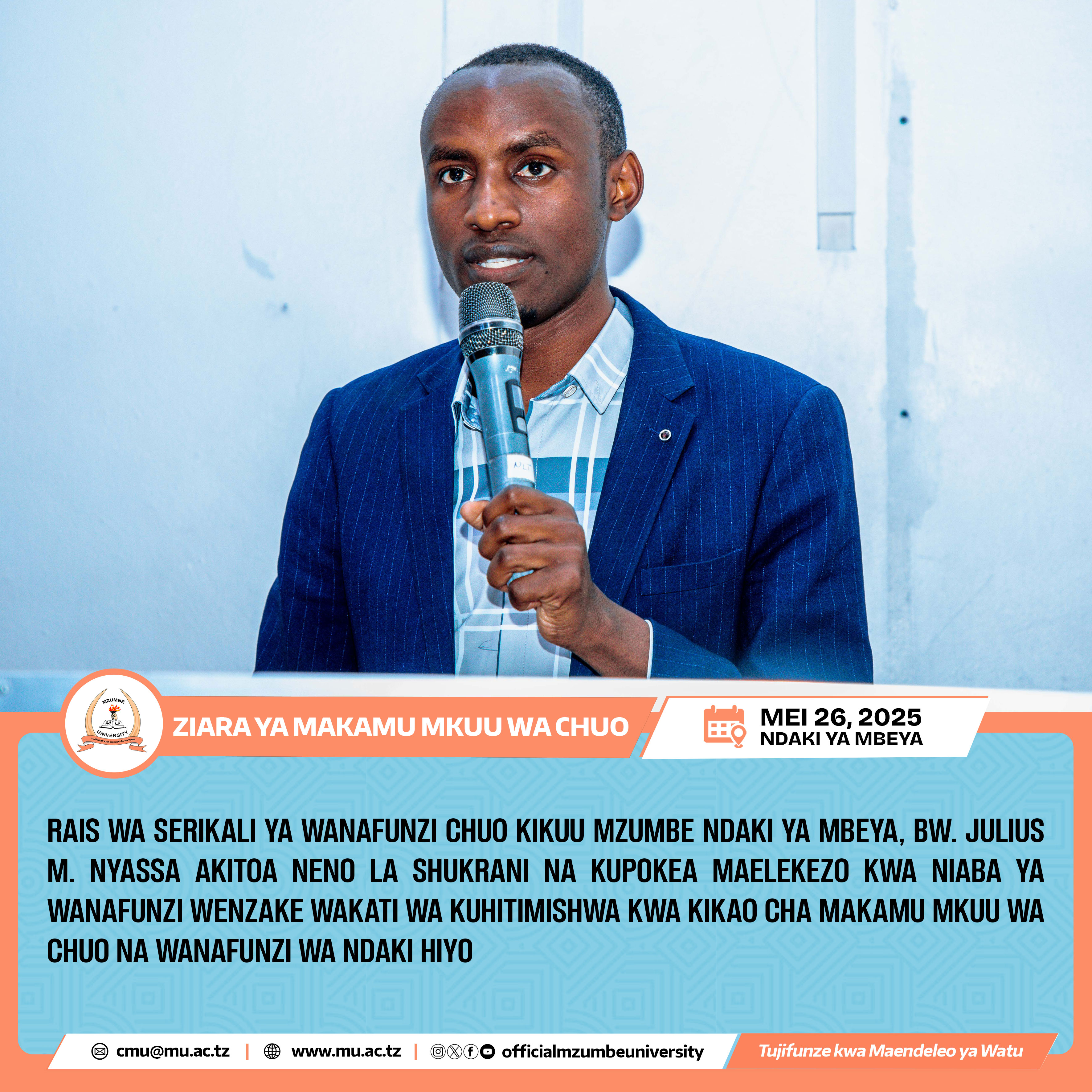 Makamu Mkuu wa Chuo Kikuu Mzumbe Prof. William Mwegoha amefanya ziara ya kikazi Ndaki ya Mbeya na kuzungumza na wanafunzi tarehe 26 Mei 2025. Lengo likiwa ni kukagua maendeleo ya wanafunzi, kusikiliza maoni na changamoto kutoka kwa wanafunzi pamoja na kutoa dira na mwelekeo wa Chuo kuhusu masuala muhimu yanayohusu elimu, mazingira na miundombinu bora ili kuhakikisha kuwa Ndaki ipo salama. Akizungumza katika kikao hicho, Prof. Mwegoha alisisitiza wanafunzi kuwa na uzalendo na Chuo kwa kukilinda na kuwajibika kuishi tunu za Chuo Kikuu Mzumbe. “Uzalendo ni jambo muhimu, ukiharibu jina la Chuo hata na wewe binafsi utakuwa umeharibu taswira yako kwa namna moja au nyingine. Linda jina na Chapa ya Chuo ambayo ni kubwa na inayoheshimika ndani na nje ya nchi yetu”, alisema Prof. Mwegoha. Aidha, Prof. Mwegoha alitumia kikao hicho kumtambulisha Naibu Makamu Mkuu wa Chuo -Taaluma, Tafiti na Ushauri, Prof. Hawa Tundui kwa wanafunzi wa Ndaki ya Mbeya ambaye ni ziara yake ya kwanza kwa Ndaki tangu apate nafasi hiyo. Prof. Hawa alisisitiza kuhusu umuhimu wa kufuata miongozo ya Chuo Kikuu Mzumbe ili waweze kuhitimu masomo yao vizuri, matumizi sahihi ya Akili Unde (AI), kuwa na nidhamu na uwajibikaji. Kwa upande wake, Naibu Makamu Mkuu wa Chuo Kikuu Mzumbe - Mipango, Fedha na Utawala Prof. Allen Mushi alieleza kuhusu miradi iliyokamilika na inayoendelea kutekelezwa na Chuo kwa Ndaki ya Mbeya ikiwemo Mradi wa Zahanati, Barabara za Ndani na Ukarabati wa Mabweni, Viwanja vya Michezo na Visima vya maji. Aliongeza kuwa wanafunzi wawe walinzi wa miundombinu hiyo ili iweze kudumu kwa muda mrefu. Katika kikao hicho, wanafunzi walipongeza jitihada za uongozi wa chuo katika kuboresha mazingira ya kujifunzia na kisha kutoa maoni na mapendekezo; ikiwa ni pamoja na kuendelea kuboresha miundombinu ya TEHAMA na Maktaba kwa ajili ya ustawi kitaaluma. Akito neno la shukrani kwa niaba ya wanafunzi wote, Rais wa Serikali ya Wanafunzi Ndaki ya Mbeya anayemaliza muda wake Bw. Julius Nyassa alitumia nafasi hiyo kumtambulisha Rais Mteule wa serikali hiyo Bw. Mifolino Maiko kwa Menejimenti, watumishi na wanafunzi, kisha kuomba wampe ushirikiano katika utekelezaji wa majukumu yake.