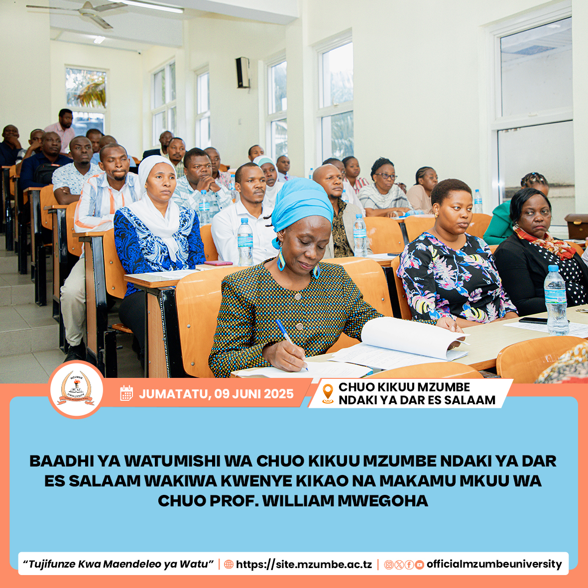 Makamu Mkuu wa Chuo Kikuu Mzumbe, Prof. William Mwegoha, amekutana na Watumishi wa Ndaki ya Dar es Salaam tarehe 9 Juni 2025 katika kikao maalumu kilicholenga kujadili masuala mbalimbali ya maendeleo ya chuo na ustawi wa watumishi. Akizungumza katika kikao hicho, Prof. Mwegoha aligusia masuala yanayohusu hali ya watumishi na chuo kwa ujumla, ikiwa ni pamoja na ongezeko la idadi ya watumishi ambayo imefikia 104 katika Ndaki hiyo. Aidha, Akiwa kama mlezi wa mfuko wa faraja Chuo Kikuu Mzumbe, alisisitiza kuwa ni chombo muhimu kwa ustawi wa watumishi na hivyo ni muhimu kuongeza ushiriki. Aliongeza kuwa kila mtumishi ana jukumu la kulinda taswira ya chuo, akisisitiza kuwa hadhi ya Chuo Kikuu Mzumbe ni kubwa na kila mmoja anapaswa kuwa sehemu ya kuitunza kupitia uwajibikaji na ufanisi wa kazi. Alisisitiza kuwa wanataaluma na watumishi wa upande wa utawala wote wanapaswa kushirikiana kwa karibu katika kutekeleza majukumu ya taasisi. Alihimiza mshikamano na kazi kwa pamoja, akisema “Teamwork is our mission.” Pia, alieleza kuwa chuo kinaendelea kutekeleza miradi mikubwa ya maendeleo ikiwemo ujenzi wa Kampasi ya Tanga kupitia Mradi wa HEET, ukarabati wa barabara za ndani na miundombinu katika kampasi zote, ukarabati wa jengo la kihistoria la Lumumba pamoja na nyumba za watumishi na kuendeleza mafunzo na maendeleo ya rasilimali watu. Kwa upande wake, Naibu Makamu Mkuu wa Chuo – Taaluma, Utafiti na Ushauri, Prof. Hawa Tundui, alisisitiza umuhimu wa kila mtumishi kuwajibika katika nafasi yake ili kuhakikisha ubora wa huduma na utoaji wa elimu. Naye Naibu Makamu Mkuu wa Chuo – Mipango, Fedha na Utawala, Prof. Allen Mushi, alieleza kuwa chuo kinaendelea na maandalizi ya Mpango Mkakati wa Maendeleo wa Sita (Corporate Strategic Plan), na kuwataka watumishi kushiriki kikamilifu kwa kutoa maoni, mapendekezo na ushauri ili kuhakikisha mpango huo unakidhi mahitaji halisi ya taasisi. Kwa upande wake, Mkurugenzi wa Utawala na Menejimenti ya Rasilimali Watu, Bi. Sophia Mchomvu, alisisitiza umuhimu wa watumishi kuhakikisha taarifa zao katika mfumo wa PEPMIS zinawasilishwa na kutumwa ipasavyo. Alieleza kuwa uongozi si jina tu, bali unahitaji kuwa na moyo wa kuwajali wanaoongozwa kwa kuhakikisha wanapewa mwongozo na nafasi ya kukua kitaaluma na kikazi. Kikao hiki kilikuwa jukwaa muhimu kwa watumishi kutoa maoni yao na kupata mwelekeo kutoka kwa uongozi wa juu wa chuo kuhusu maendeleo na mustakabali wa taasisi.