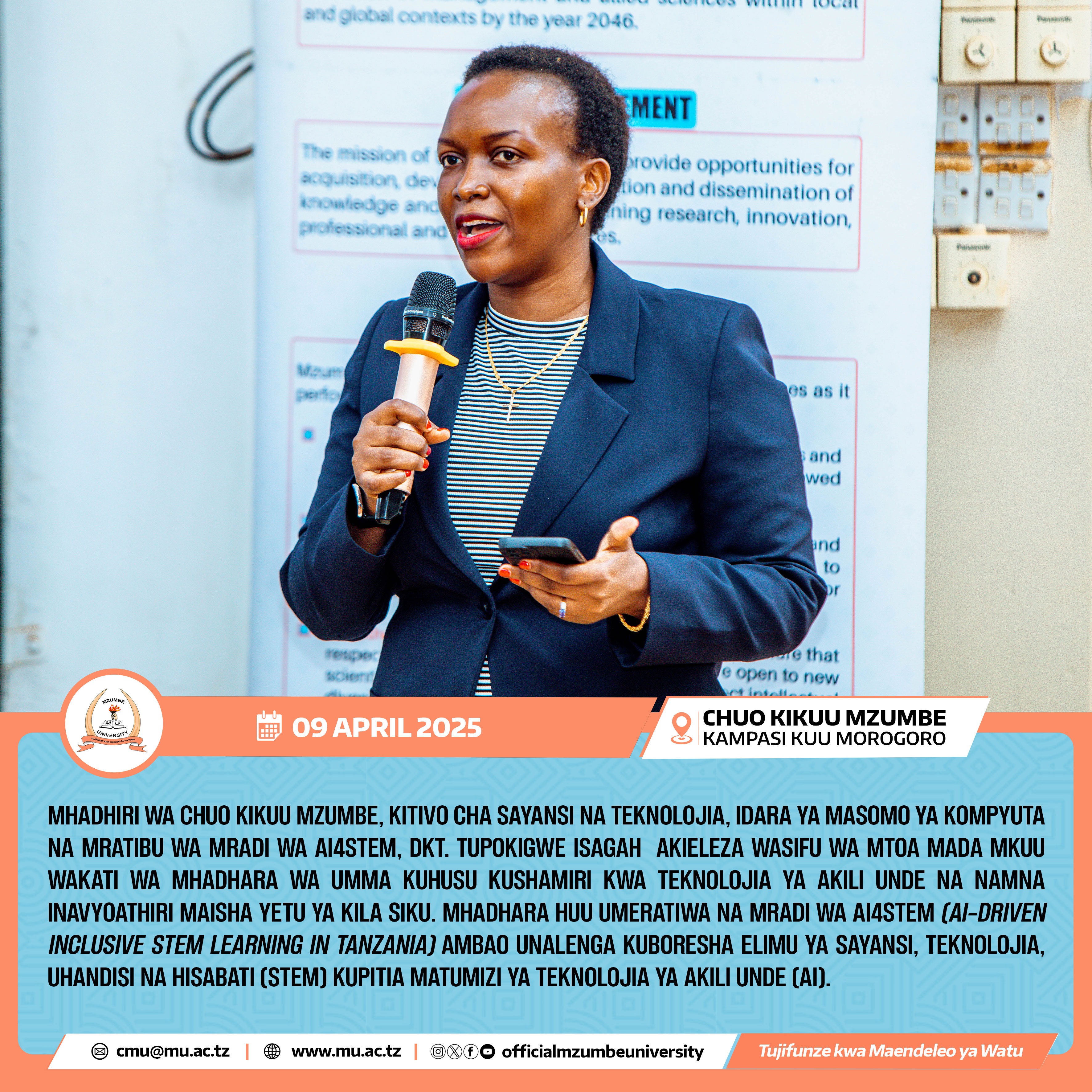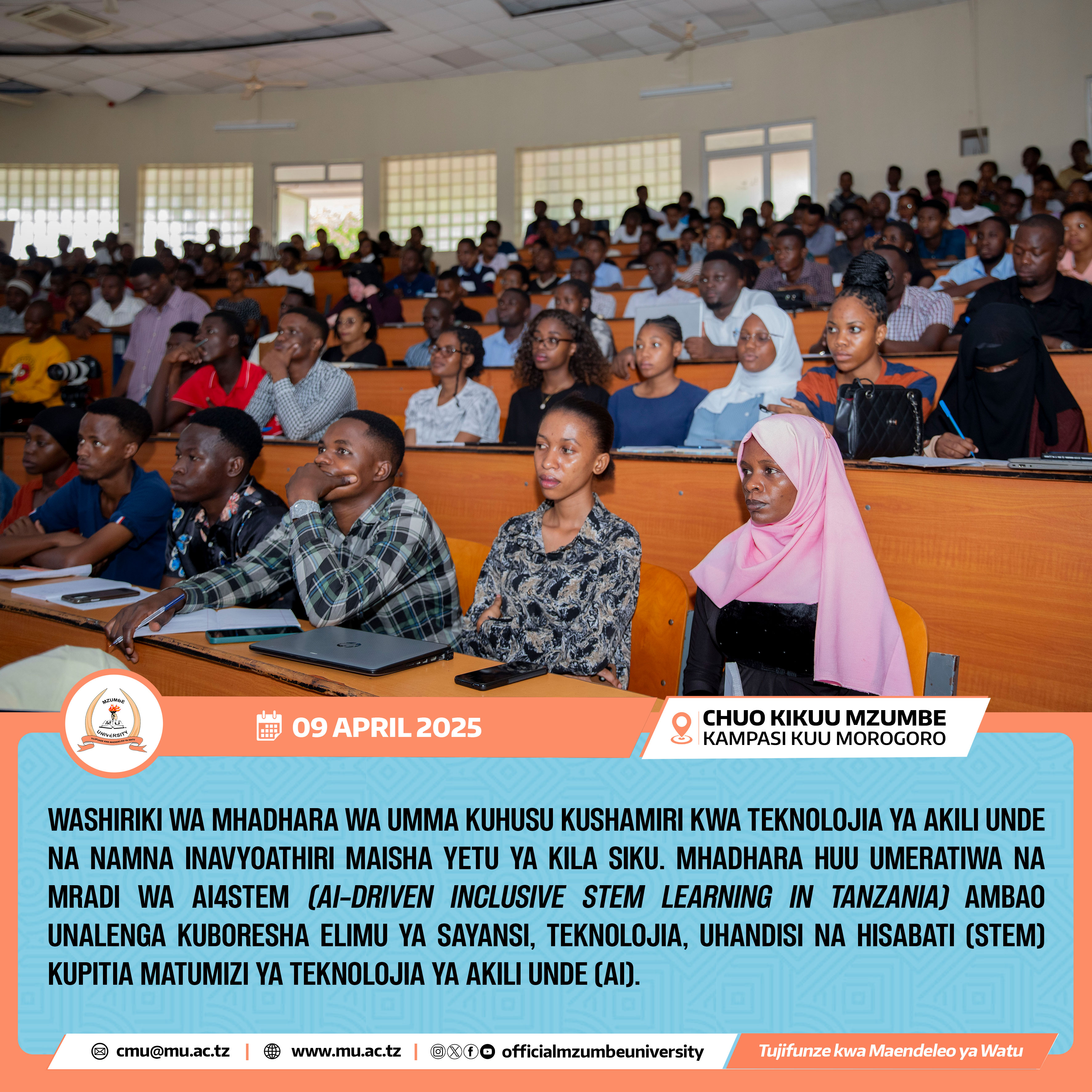 Chuo Kikuu Mzumbe kupitia Kitivo cha Sayansi na Teknolojia, Idara ya Masomo ya Kompyuta, kimeendesha Mhadhara wa Umma uliojikita katika mada ya "Kushamiri kwa Teknolojia ya Akili Unde na Namna Inavyoathiri Maisha ya Kila Siku". Mhadhara huo umefanyika tarehe 09 Aprili 2025, chini ya uratibu wa Mradi wa AI4STEM (AI-Driven Inclusive STEM Learning in Tanzania). Akizungumza katika ufunguzi wa mhadhara huo, Mtiva wa Kitivo cha Sayansi na Teknolojia, Dkt. Joseph Sungau, alieleza kuwa lengo kuu ni kutoa uelewa mpana kwa wanafunzi na wafanyakazi wa Mzumbe kuhusu matumizi chanya ya teknolojia hiyo ya kisasa katika maisha ya kila siku. Pia, alisisitiza juu ya umuhimu wa kuwa na maarifa sahihi kuhusu Akili Unde(AI) ili kuendana na mabadiliko ya kiteknolojia duniani. Kwa upande wake mtoa mada mkuu, Prof. Tony Belpaeme kutoka Chuo Kikuu cha Ghent nchini Ubelgiji ambaye ni Profesa wa Roboti na Mifumo ya Kifahamu (Professor in Robotics and Cognitive Systems), alifafanua kwa kina kuhusu kushamiri kwa Teknolojia ya Akili Unde: Namna Inavyoathiri Maisha ya Kila Siku. Katika maelezo yake, Prof. Belpaeme alisisitiza juu ya nafasi ya Akili Unde na roboti katika kuleta mapinduzi kwenye sekta ya elimu, afya na huduma mbalimbali za kijamii, sambamba na changamoto zinazoweza kujitokeza endapo matumizi ya teknolojia hiyo hayatadhibitiwa ipasavyo. Mhadhara huo ulihusisha pia majadiliano ya wanajopo kutoka maeneo mbalimbali ya kibobezi waliotoa michango yao, akiwemo Dkt. Lorah Bosoline Madete kutoka Tume ya Mipango, Bw. Melchiory Baltazary kutoka TAMISEMI, Dkt. Tupokigwe Isagah na Dkt. Morice Daud ambao ni Wahadhiri wa Masomo ya Kompyuta Chuo Kikuu Mzumbe. Mjadala huo uliendeshwa na Mratibu wa Mradi, Bw. Edger Lutatora. Kwa upande wao, baadhi ya wanafunzi walieleza kufurahishwa na elimu waliyoipata, wakisema kuwa wameweza kuelewa zaidi jinsi Akili Unde inavyoweza kubadilisha mazingira ya kazi, masomo na maisha kwa ujumla, huku wakihimizwa kujiandaa kuwa wabunifu na wachangiaji katika matumizi sahihi ya teknolojia hiyo. Kupitia mjadala huo, washiriki wameweza kupata uelewa wa kina kuhusu mwelekeo wa dunia katika nyanja ya AI na nafasi yao kama wataalamu wa baadaye katika kuhakikisha matumizi salama, jumuishi na yanayozingatia maadili ya teknolojia hii bunifu.