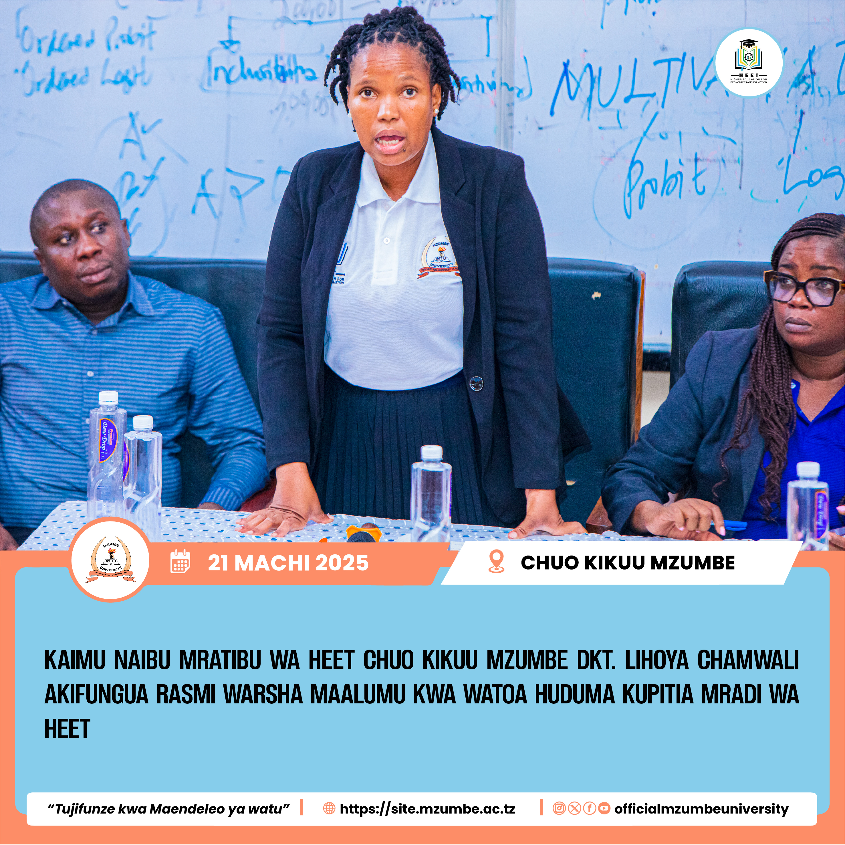 Warsha maalumu ya watoa huduma (wadau) wa Mradi wa Elimu ya Juu kwa Mageuzi ya Kiuchumi (HEET) imefanyika Kampasi Kuu, Chuo Kikuu Mzumbe, tarehe 21 Machi 2025, ikiwakutanisha waratibu wa mradi wa HEET Chuo Kikuu Mzumbe na watoa huduma mbalimbali kwa lengo la kuwaelimisha katika maeneo ya Miundombinu, Mazingira, Jinsia, Jamii, Afya na Usalama pia kuwashirikisha katika utekelezaji wa mradi huo ili kuhakikisha unafanikishwa kwa ufanisi. Akifungua Warsha hiyo, Kaimu Naibu Mratibu wa Mradi wa Elimu ya Juu kwa Mageuzi ya Kiuchumi (HEET) katika Chuo Kikuu Mzumbe Dkt. Lihoya Chamwali, alisema lengo la warsha hiyo ni kuwaelimisha wadau walioshiriki ambao ni viongozi wa serikali, maafisa utumishi, wataalamu wa mazingira, wawakilishi wa jamii, wahandisi wa miundombinu pamoja na wataalamu wa jinsia na afya katika utekelezaji wa mradi huo. Naye Mratibu wa mradi wa HEET Kwa upande wa miundombinu, ambaye pia ni Kaimu Mkurugenzi wa Kitengo cha Miliki wa Chuo Kikuu Mzumbe, Bw. Joseph Ng'wala, alieleza hatua zilizofikiwa katika ujenzi wa majengo mapya. Naye Mratibu wa HEET upande wa mazingira, Dkt. Editha Ndunguru, aliwasilisha mada kuhusu nguzo kuu za Benki ya Dunia, akisisitiza uzingatiaji wa viwango vya kimazingira katika utekelezaji wa mradi huo. Kwa upande mwingine, Mratibu wa HEET upande wa jinsia na mahitaji maalumu, Dkt. Perpetua Kalimasi, alizungumzia unyanyasaji wa kijinsia na kingono kwa watoa huduma, akihimiza kuwepo kwa mifumo ya kuzuia ukatili wa kijinsia. Naye Mratibu wa HEET anayehusika na kudhibiti athari za mradi kwa jamii, Dkt. Christina Shitima, alieleza taratibu za usimamizi wa malalamiko, akisisitiza uwazi na ushirikishwaji wa jamii. Kwa ujumla, warsha hii imeonesha dhamira ya Chuo Kikuu Mzumbe katika kuhakikisha wadau wake wanapata uelewa wa kina kuhusu mradi wa HEET. Kwa upande mwingine, viongozi wa serikali na maafisa utumishi walioshiriki walielezea kuridhishwa kwao na hatua zinazochukuliwa katika utekelezaji wa mradi huo. Mwisho, Dkt. Chamwali aliwashukuru washiriki kwa mchango wao na kuwataka kushirikiana kwa karibu ili kuhakikisha mradi wa HEET unatekelezwa kwa mafanikio.
