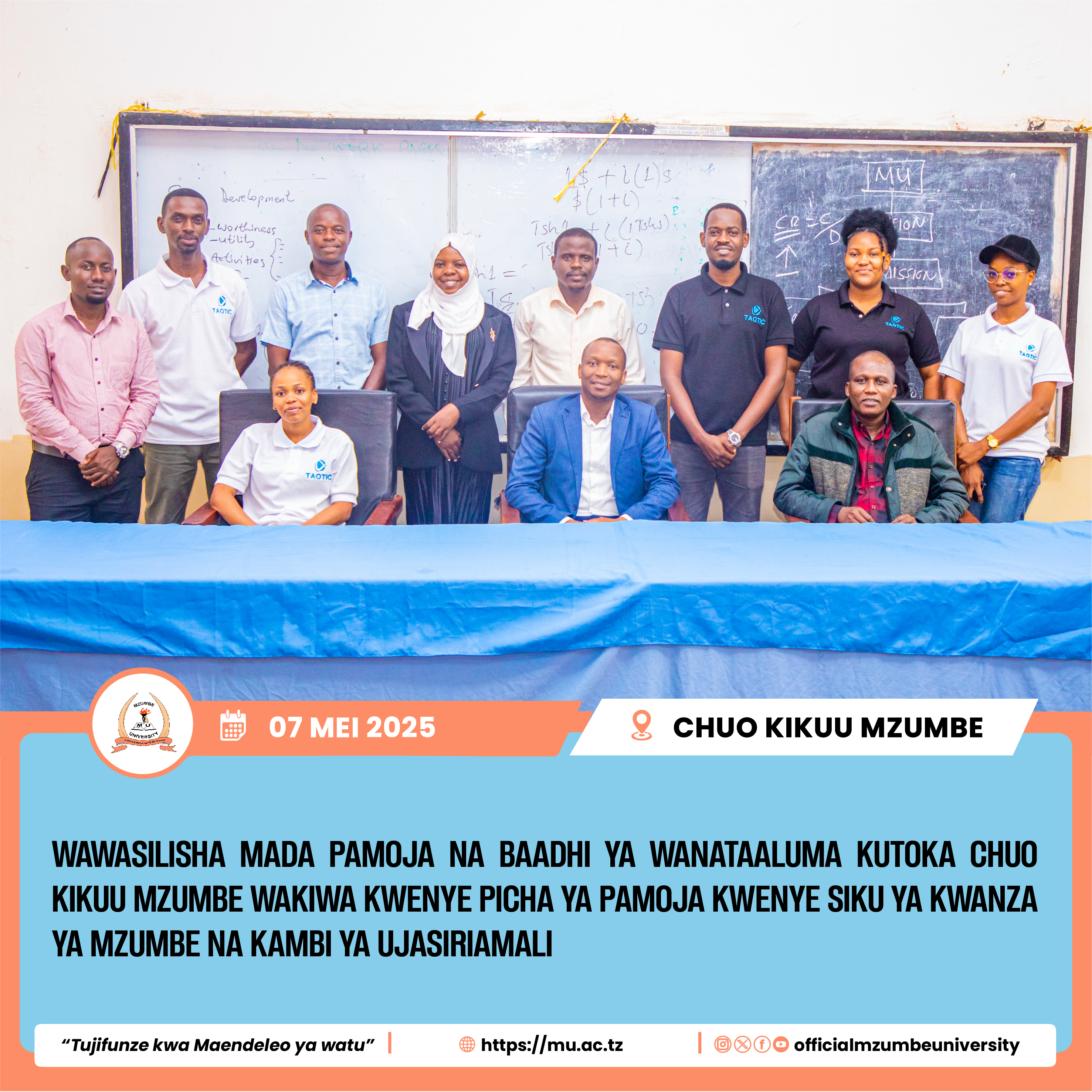 Chuo Kikuu Mzumbe kupitia Kitengo cha Ubunifu, Ujasiriamali na Uhusiano wa Kitasnia, kimeadhimisha Siku ya Mzumbe na Kambi ya Ujasiriamali katika Kampasi Kuu ya Morogoro, tarehe 7 Mei 2025 na kuhudhuriwa na washiriki kutoka sekta mbalimbali za elimu, biashara, uwekezaji na taasisi za serikali. Akizungumza wakati wa tukio hilo, Kaimu Makamu Mkuu wa Chuo Kikuu Mzumbe, Profesa Hawa Tundui, alisisitiza kuwa tukio hilo linaendana na mkakati wa chuo wa kukuza elimu ya vitendo, ubunifu na ujasiriamali kama nyenzo ya kujenga uchumi shindani unaotegemea maarifa. Alieleza kuwa kupitia kambi hiyo, washiriki watapata nafasi ya kuibua mbinu mpya za kujiajiri na kuanzisha biashara zenye tija. Kwa upande wake, Meneja wa Kitengo cha Ubunifu, Ujasiriamali na Uhusiano wa Kitasnia – Chuo Kikuu Mzumbe, Profesa Emmanuel Chao, alieleza kuwa Siku ya Mzumbe na Kambi ya Ujasiriamali ni sehemu ya juhudi endelevu za chuo kuwa kiungo kati ya taaluma na jamii, kwa kukuza ushirikiano wa kimkakati kati ya wanafunzi, sekta binafsi na wadau wa maendeleo. Aidha, tukio hilo lilipewa heshima ya kipekee na Mwakilishi wa Shirika la Global Expert Bureau, Bw. Kabeho Solo, ambaye alikabidhi nakala 50 za kitabu cha “The Business of People” kwa Naibu Makamu Mkuu wa Chuo – Taaluma, Utafiti na Ushauri wa Kitaaluma – Chuo Kikuu Mzumbe, Profesa Hawa Tundui, kama mchango wa maarifa kwa maendeleo ya elimu na uongozi wa kijamii. Vilevile, washiriki walifaidika na mada mbalimbali zilizowasilishwa na wataalamu waliobobea katika maeneo ya ujasiriamali na uwekezaji. Miongoni mwao alikuwa Mkurugenzi Mtendaji wa Shirika la TAOTIC, Bw. Kiko Kiwanga, aliyezungumzia mada kuhusu “Uchaguzi wa Taaluma na Mustakabali wa Ajira: Ujasiriamali wa Kijamii Unaotegemea Ubunifu”, ambapo alisisitiza umuhimu wa vijana kujitambua na kutumia changamoto kama fursa za kujiajiri. Kwa upande mwingine, Afisa wa Ufuatiliaji na Tathmini kutoka Baraza la Taifa la Uwezeshaji Wananchi Kiuchumi (NEEC), Bw. Oswald Y. Karadisi, aliwasilisha mada kuhusu fursa mbalimbali zinazotolewa na baraza hilo katika kuwawezesha wananchi kiuchumi. Alihimiza washiriki kujitokeza kwa wingi katika programu za mafunzo, mitaji na uungwaji mkono wa kitaalamu. Sambamba na hayo, Afisa Uwekezaji kutoka Taasisi ya Uwekezaji ya (UTT AMIS), Bw. Fredric P. Lushinge, aliwasilisha mada kuhusu fursa za uwekezaji zinazotolewa na mfuko huo, akieleza umuhimu wa vijana kuanza kupanga maisha yao kifedha kwa kuwekeza mapema katika bidhaa salama na zenye manufaa ya muda mrefu. Siku ya Mzumbe na Kambi ya Ujasiriamali imeonesha dhamira ya dhati ya Chuo Kikuu Mzumbe katika kuwa kiungo muhimu kati ya taaluma, ubunifu na maendeleo ya kijamii na kiuchumi kupitia ushirikiano kati ya vijana, taasisi za kifedha, mashirika ya maendeleo na sekta binafsi. Chuo Kikuu Mzumbe, Tujifunze Kwa Maendeleo ya Watu.